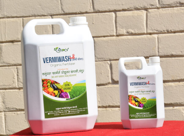 Vasundhara vermi wash is a liquid fertilizer extracted from vermi composting beds. It is a pure collection of excretory products and mucus secretions of worms. it is rich in plant growth hormones micronutrients. It is sprayed on plant leaves or can be feed at roots of plants for better growth It also prevents fungal bacterial pathogen and pests. it is almost 85% more rich in phosphorus, calcium and magnesium and having higher amount of micro nutrients than vermi compost. it is diluted with water in a ratio of 1:10 & then sprayed on plants. It helps to increase production of crop.